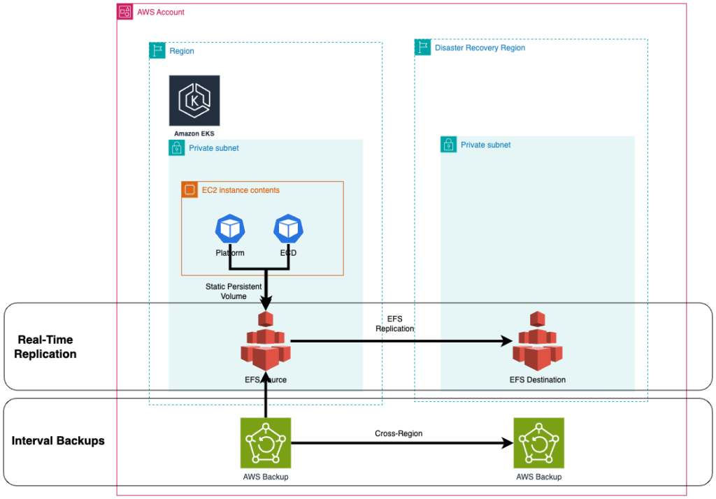 For region disaster recovery, file systems need to be backed up to a fallback region, so that the filesystem can be restored in order to do disaster recovery. One feature of EFS that simplifies this greatly is that of EFS Access Points. With Access Points, applications can consistently mount specific directories within the EFS file system, regardless of the underlying file system structure. This should simplify the restoration process in a fallback region, as the EKS persistent volumes can be created without reference to the old EFS file system. With the EFS replication strategy in place, applications can quickly re-mount the EFS access points and have access to the latest data almost immediately.